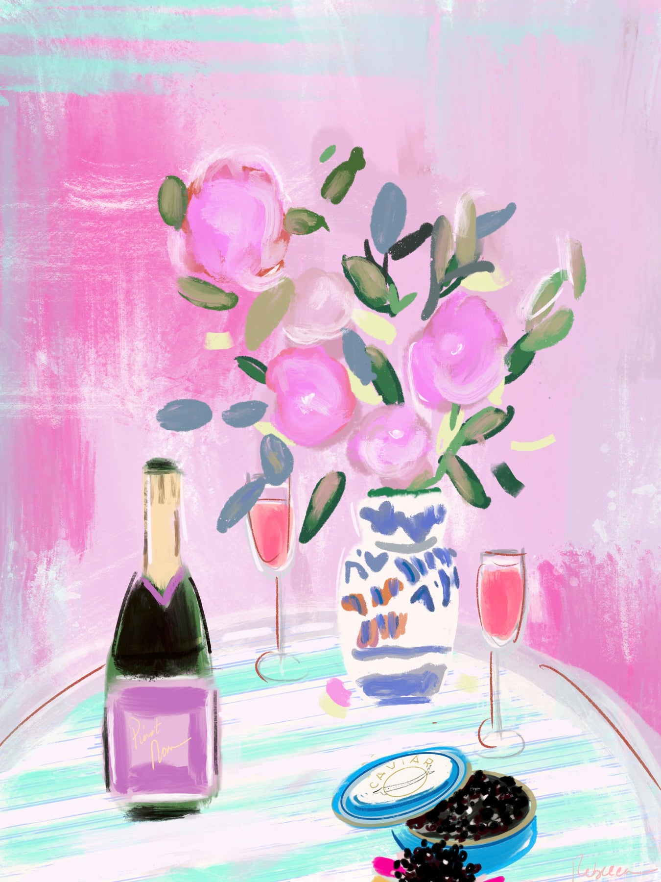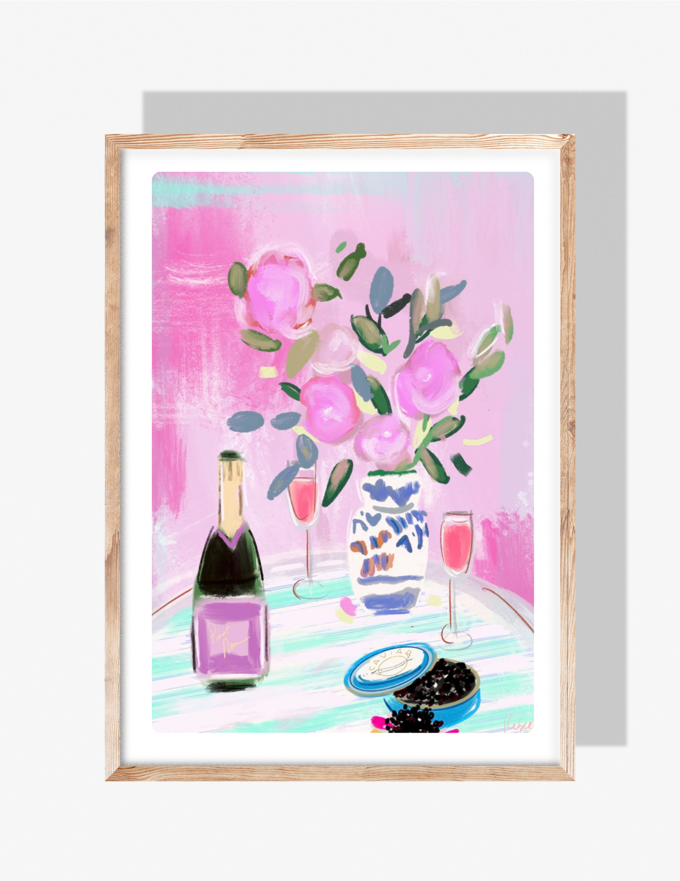 ‘Champagne Dreams’ captures the elegance of indulgence with a luxurious arrangement of champagne, caviar, and delicate flowers. This art print evokes a sense of celebration, sophistication, and timeless glamour, perfect for adding a touch of luxury to any space.