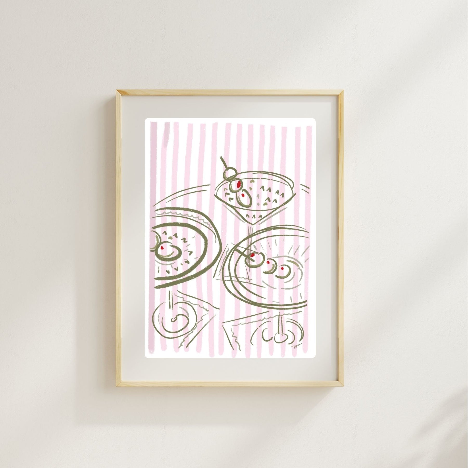Stylish and playful, this art print features classic martinis set against a vibrant pink striped backdrop. The bold colors and chic design bring a fun, modern energy to any space, perfect for cocktail lovers or anyone looking to add a touch of sophistication with a pop of color.
