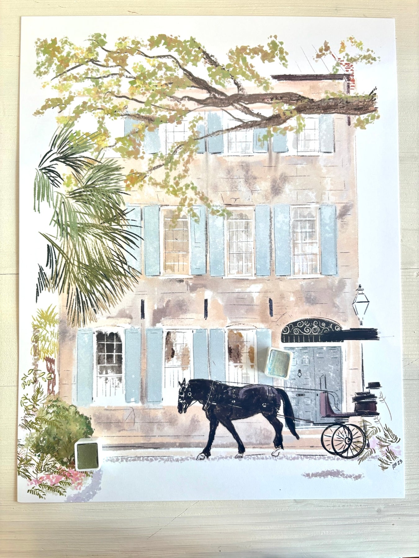 Capture the charm of historic Charleston with this beautifully detailed Black Horse on Tradd Street Art Print by Rebecca Illustrated. This soft pastel illustration features a picturesque Tradd Street home, complete with iconic blue shutters, lush southern greenery, and a graceful black carriage horse strolling through the scene.