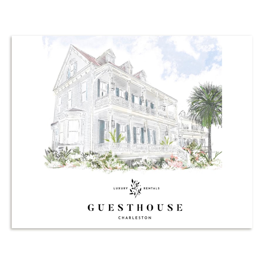 This hand-drawn architectural illustration showcases the timeless elegance of the Charleston Guesthouse, known for its sweeping double porches, classic detailing, and lush Lowcountry landscaping. Rendered in a soft, sophisticated palette, this artwork highlights the home’s graceful historic character while giving it a modern, minimal, and elevated feel.
