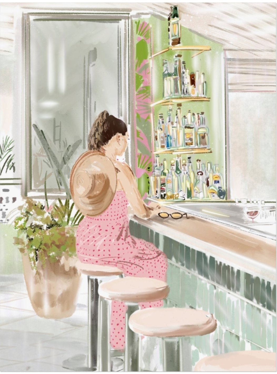 This art print captures a serene moment at The Little Palm, where coastal charm meets laid-back luxury. A woman in a chic pink dress and wide sunhat sits at the bar, surrounded by tropical greenery, pastel tones, and rows of gleaming bottles. With its breezy elegance and vacation-ready vibe, this piece evokes the joy of slow afternoons and stylish escapes.