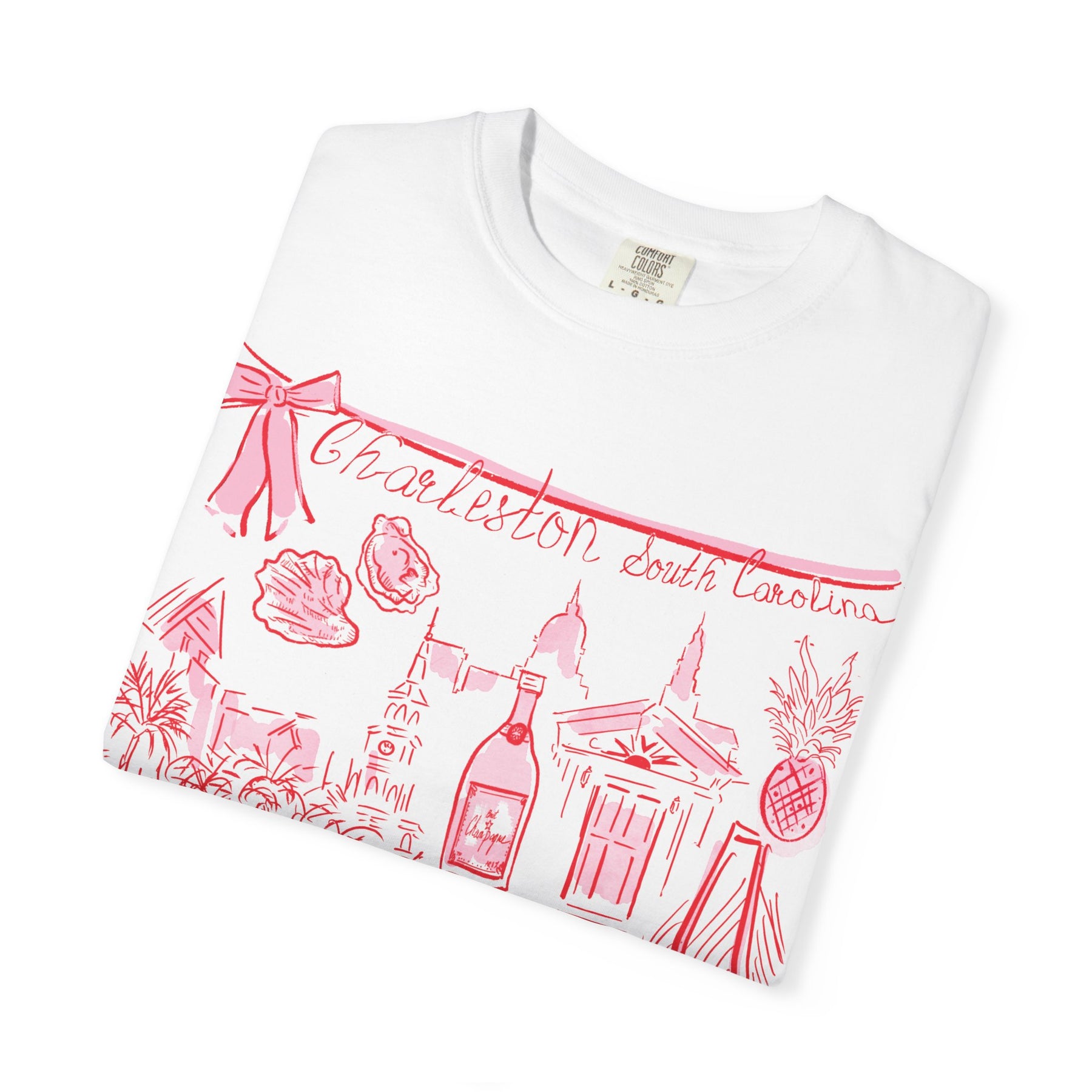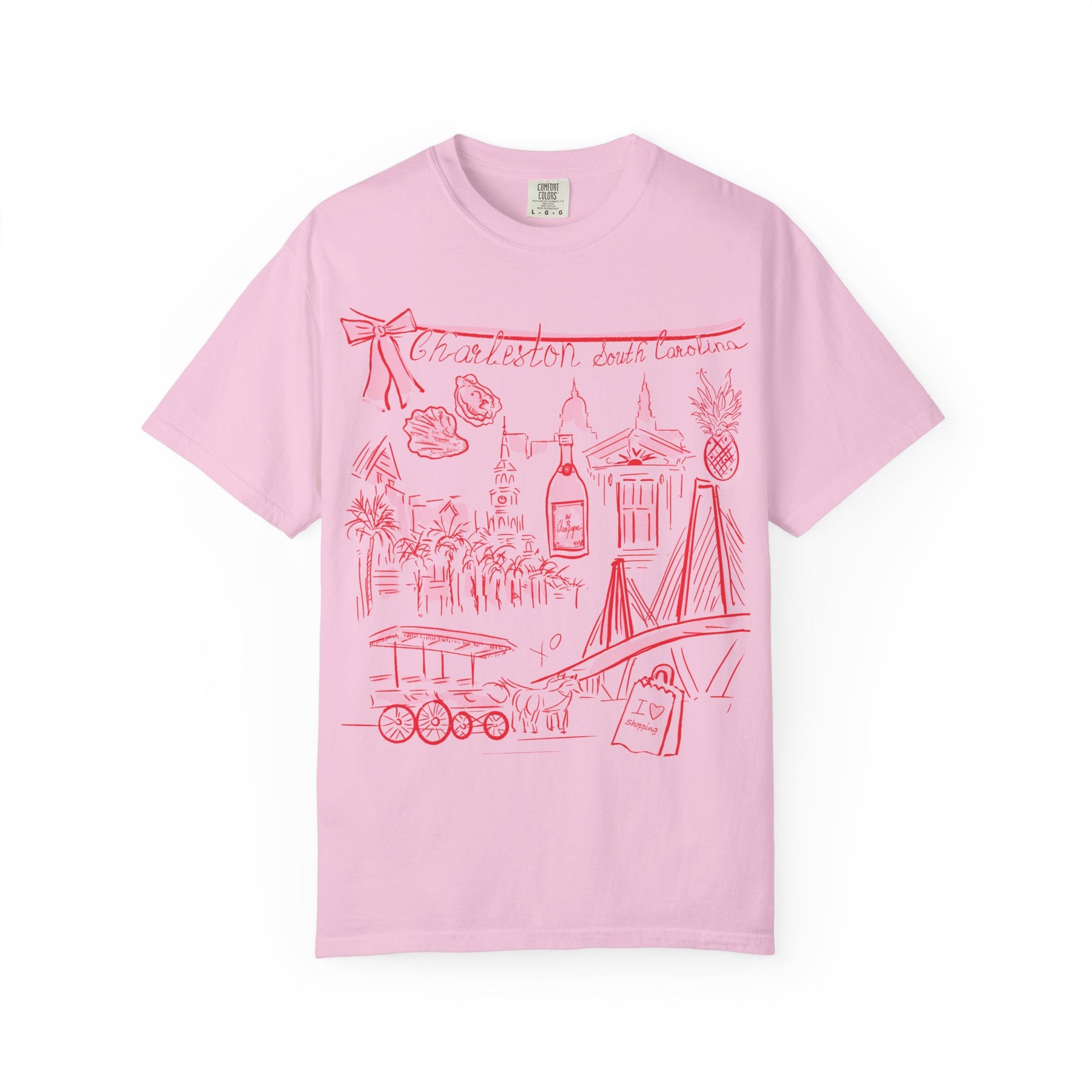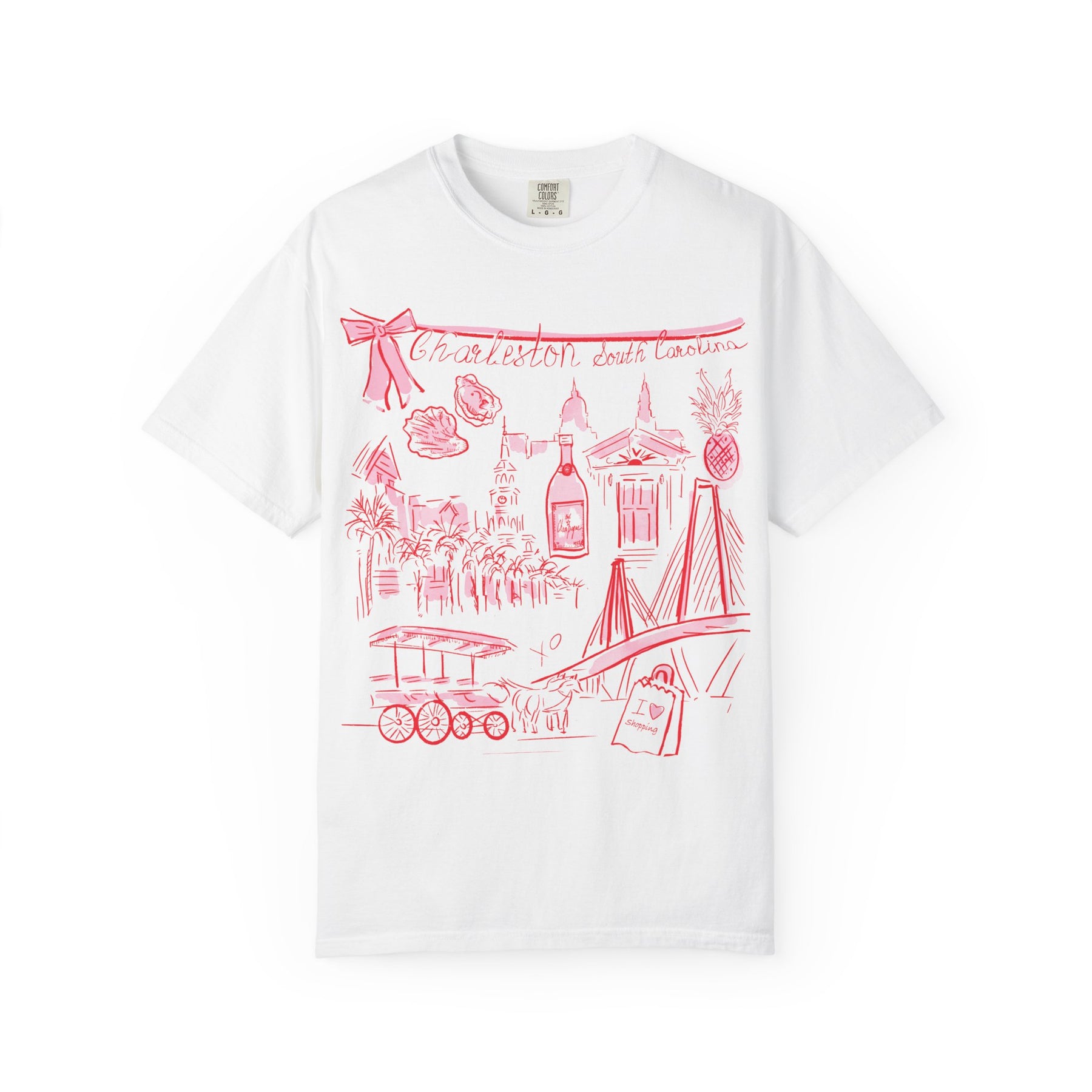 Show off your love for the Holy City with this charming Charleston graphic tee. Featuring hand-drawn illustrations of iconic local symbols — from Rainbow Row and the Ravenel Bridge to oysters, palmettos, and horse-drawn carriages — this shirt captures the city’s southern charm in a playful pink design.