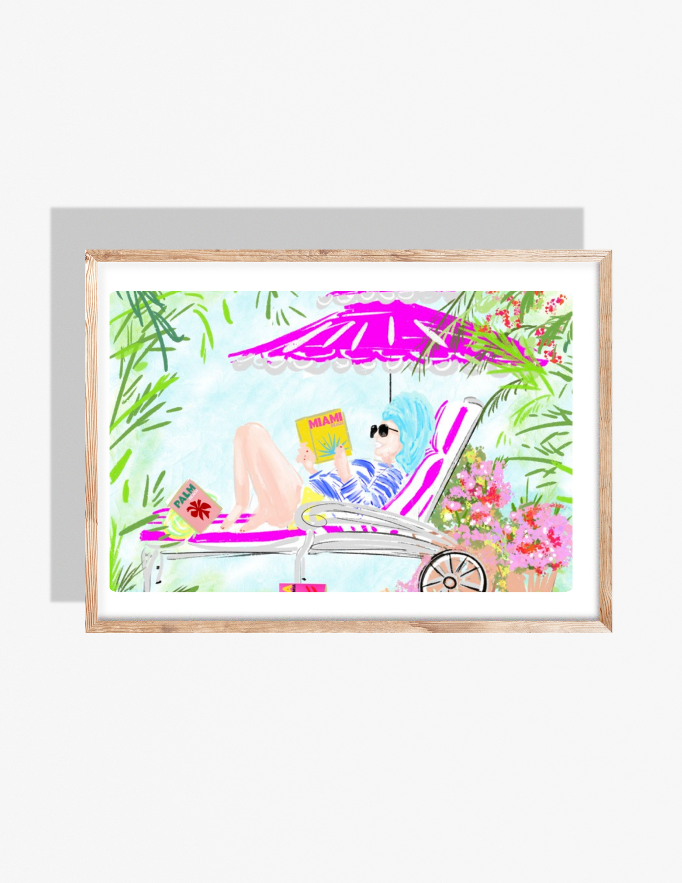 A serene and stylish art print of a lady lounging by the pool, enjoying a good book, and soaking up the sun with sunscreen at hand. This vibrant, relaxing scene captures the joy of summer leisure and the art of taking time for yourself.