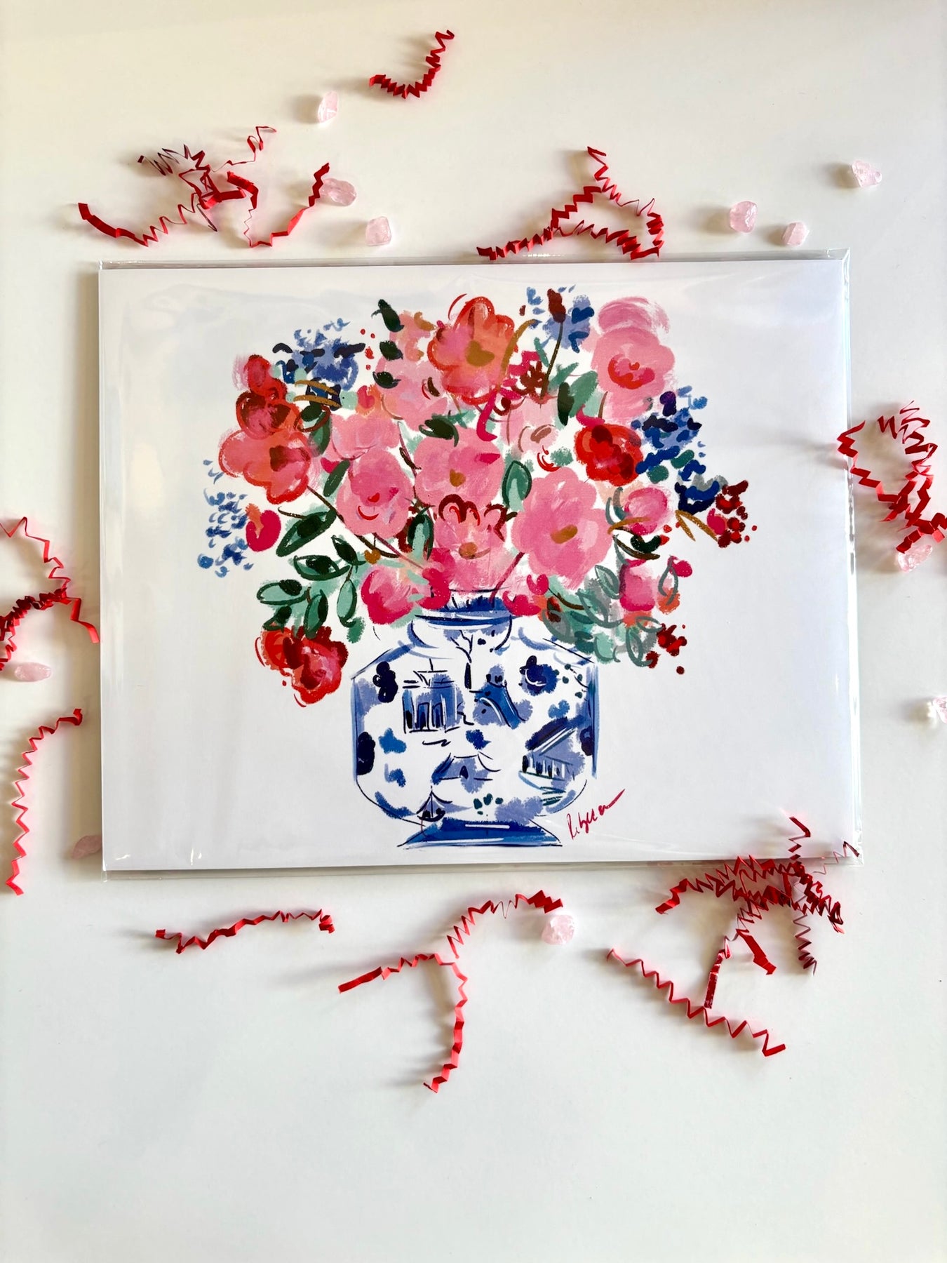 Petals in Bloom celebrates color, creativity, and the beauty of fresh florals. Hand illustrated by Rebecca Illustrated, this art print features expressive pink blooms overflowing from a classic blue and white vase, layered with playful brushstrokes and rich, cheerful color.