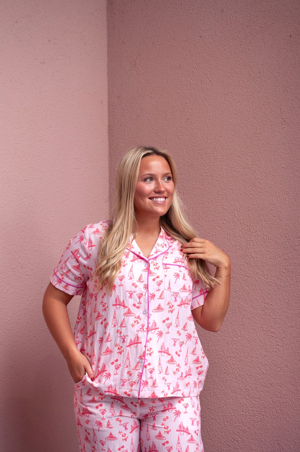 This two-piece pajama set includes a short sleeve top and matching pants, thoughtfully designed for relaxed evenings, cozy mornings, and all-day lounging. Featuring Rebecca Illustrated’s signature hand-painted style, this set blends wearable art with effortless comfort.
